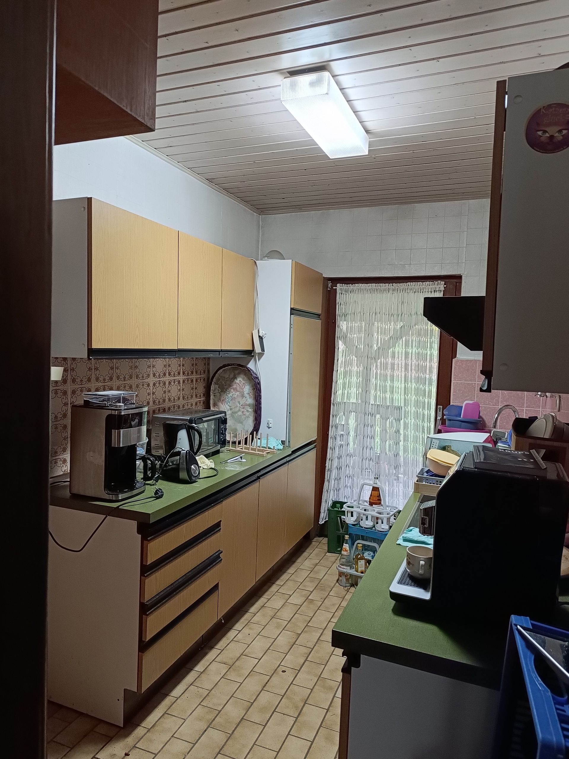 Eine Einbauküche mit Zugang zur überdachten Terrasse hinterm Haus.